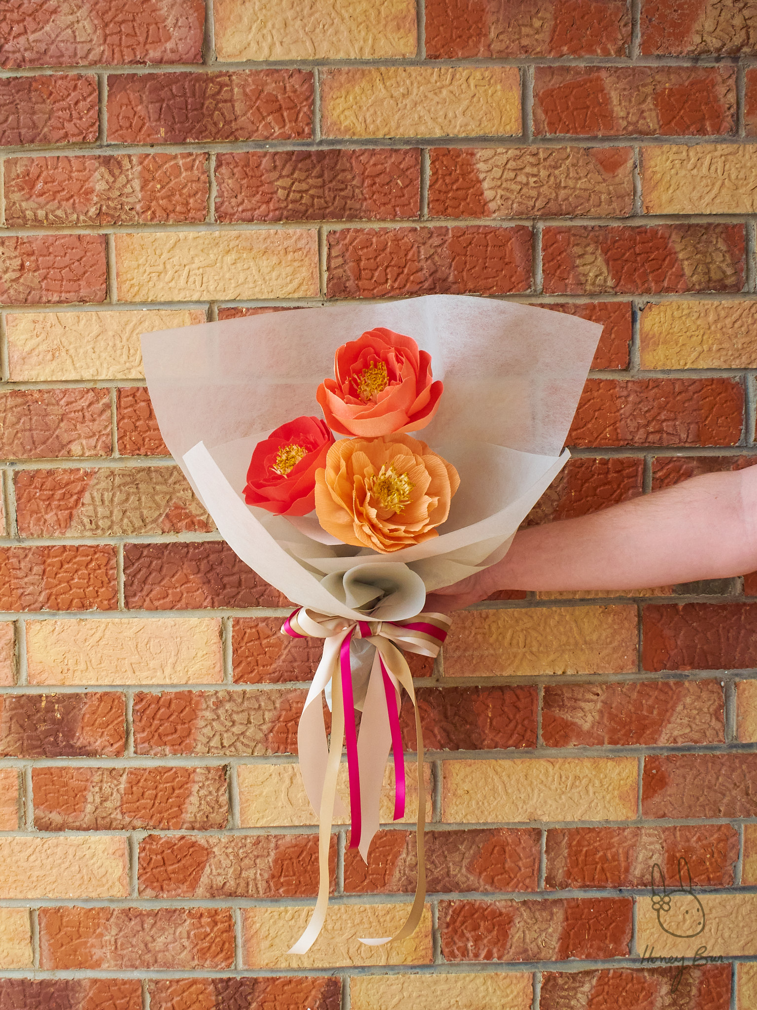 P E O N I E S – Bloomed paper peonies in shades of coral, rust and peach wrapped in soft non-woven wrap and finished with complimentary ribbons.